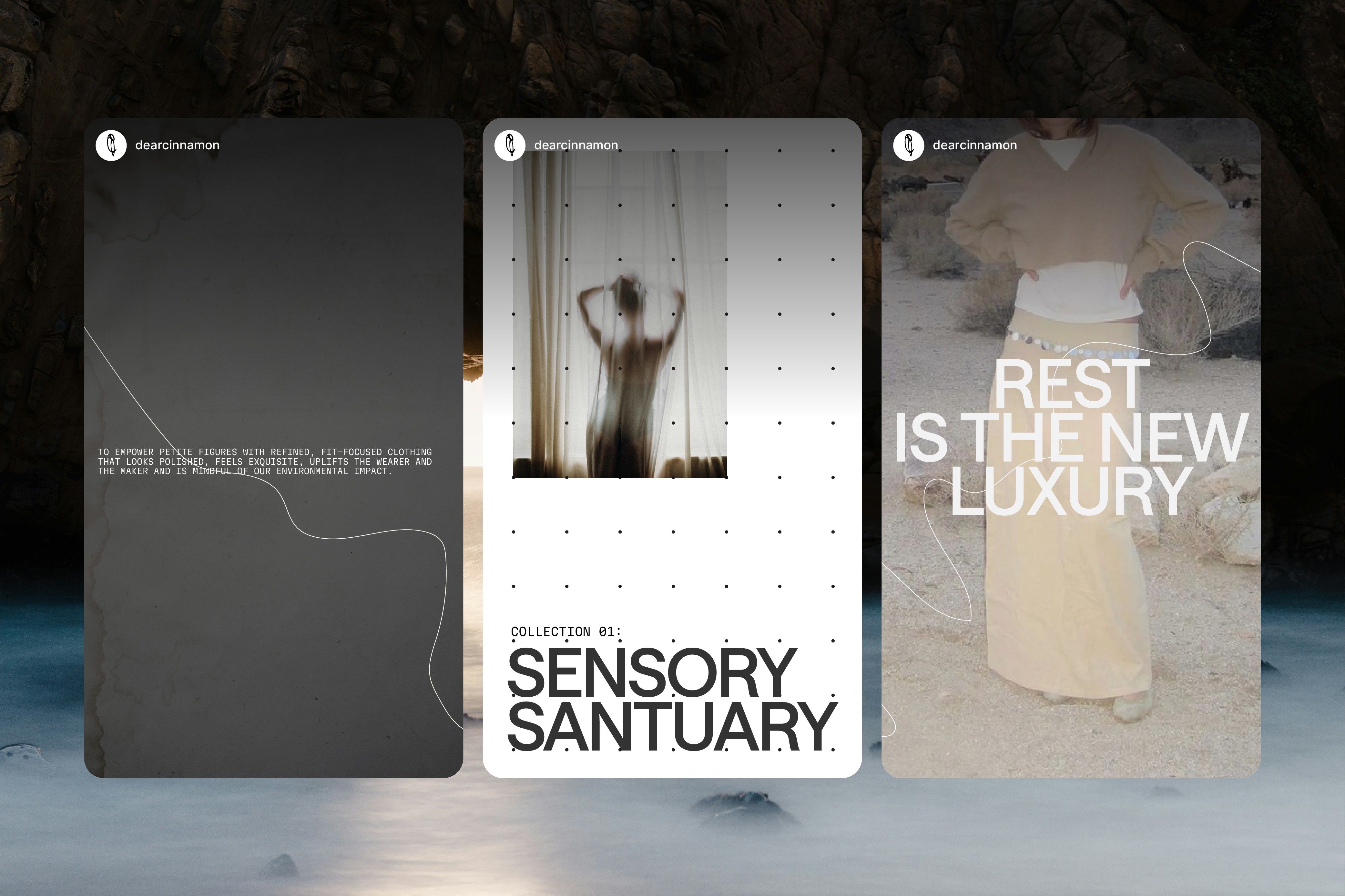 Dear Cinnamon is a petite fashion brand rooted in care and consideration. Its design language leans into humanist principles — soft textures, material-led details, and a sense of craft that feels intentional rather than decorative. The system is designed to be flexible and tactile, allowing subtle imperfections, calm typography, and generous spacing to create a feeling of closeness. Every element is considered to support a quiet, thoughtful experience — where design feels personal, warm, and made with attention.